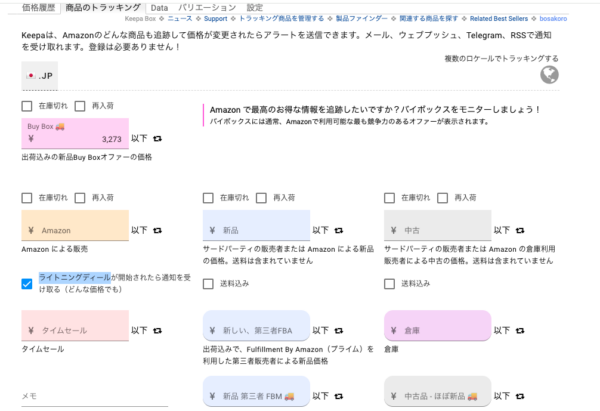 - ライトニングディール: チェックを入れると、その商品がタイムセールの対象になった瞬間に通知を受け取れます