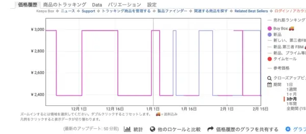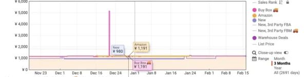 - 紫: マーケットプレイス(公式以外の店)の新品価格(市場全体の相場)。